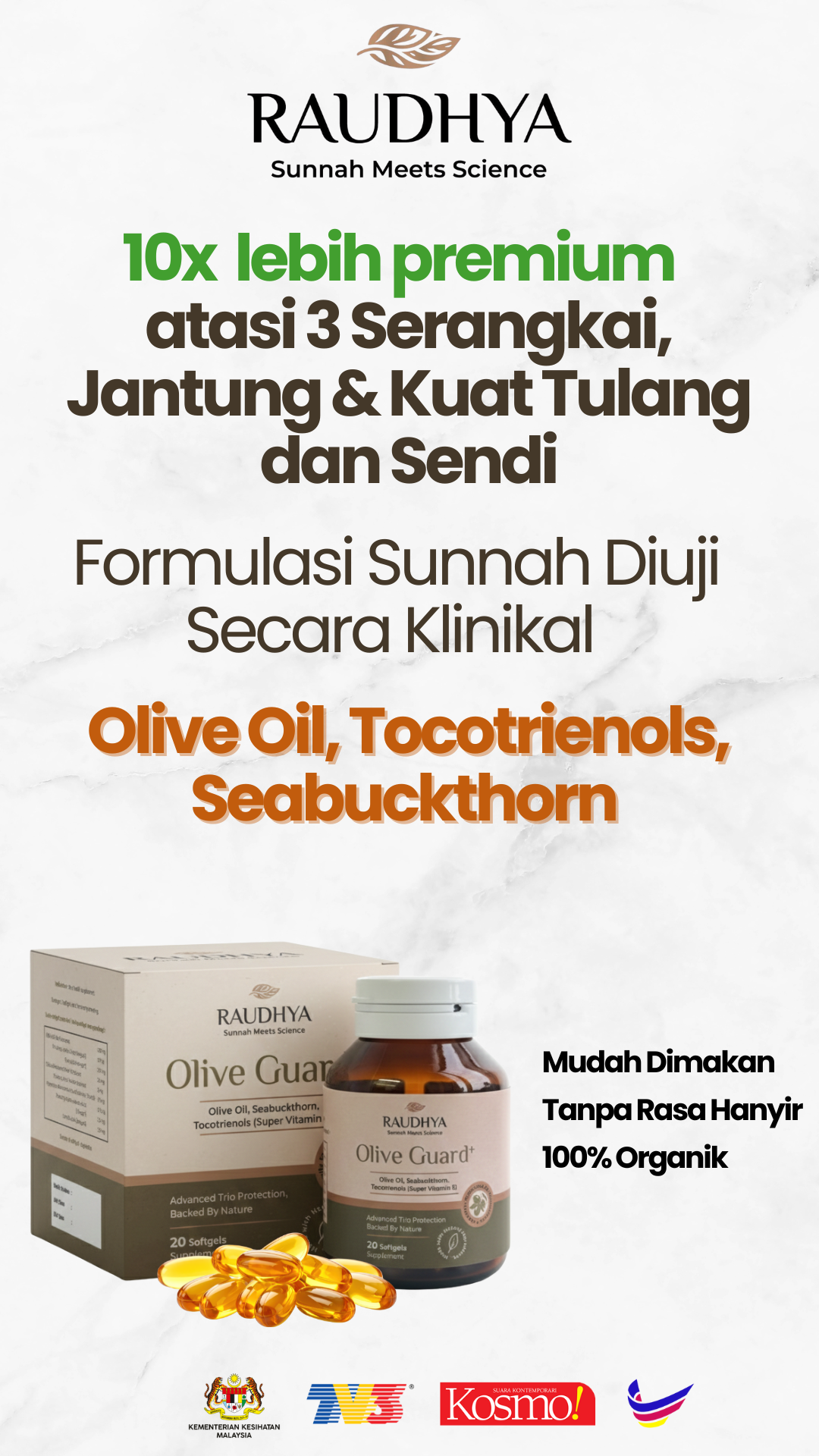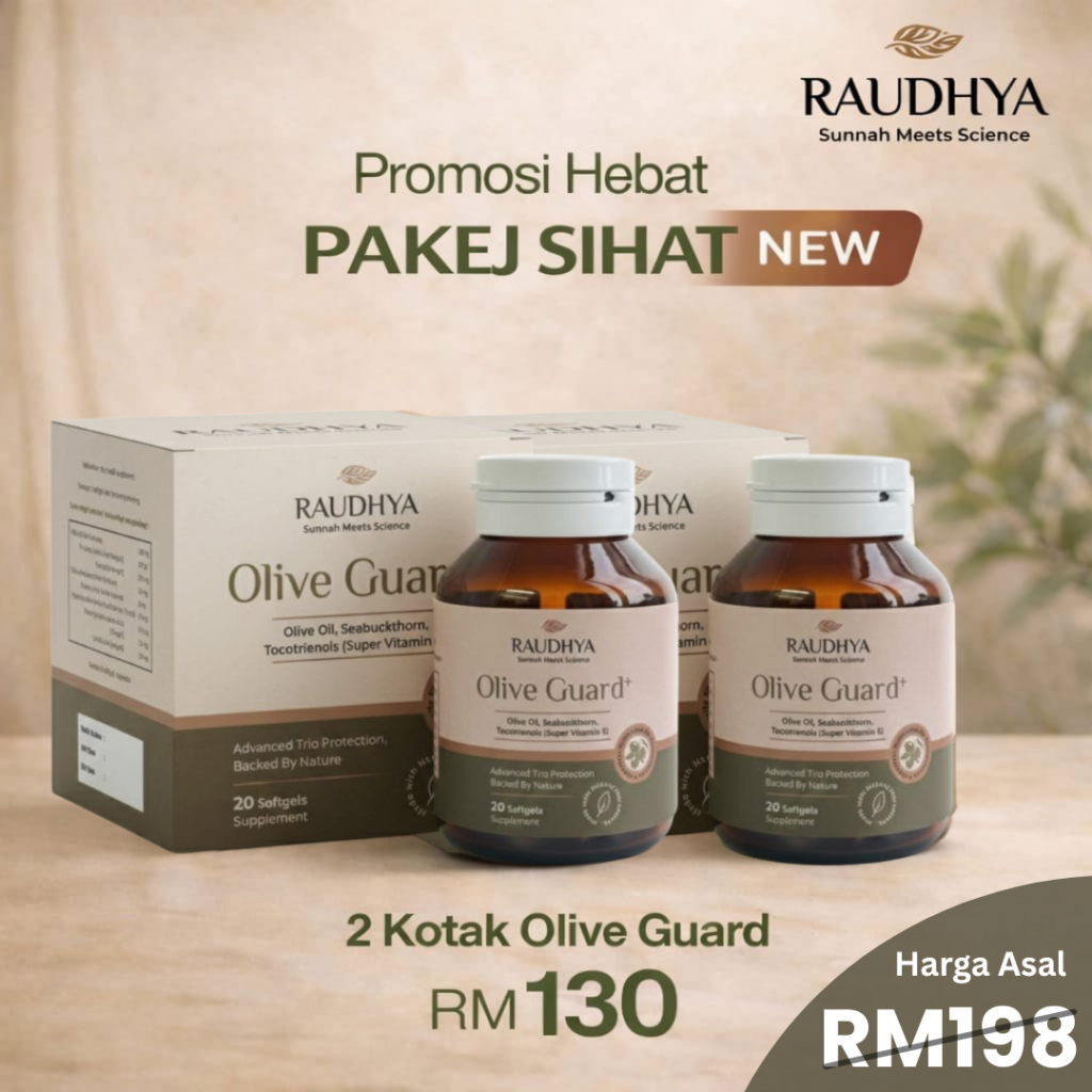 Raudhya OliveGuard+ Diperkaya Bahan Aktif Polyphenols, Tocotrienols (Super Vitamin E) & Omega Aktif Menyokong Kawalan Gula, Kolesterol & Tekanan Darah